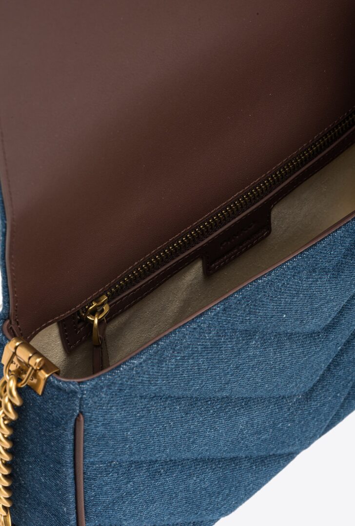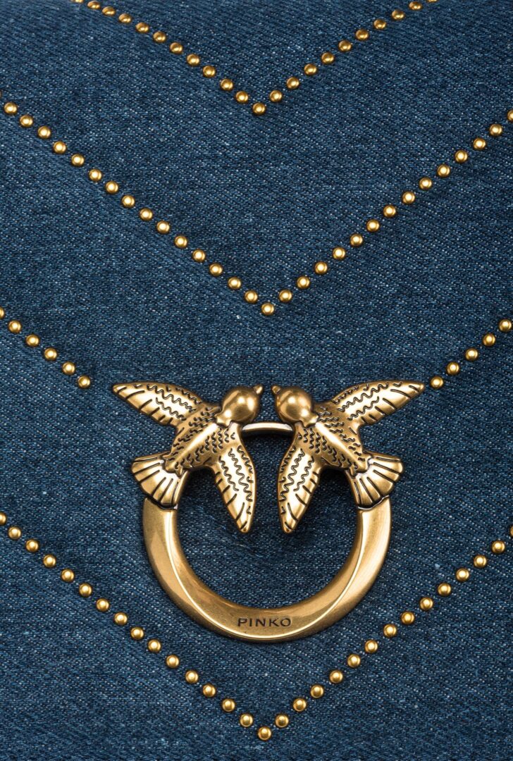 Сумка Classic Love Bag Click выполнена из денима со стеганым шевронным узором и декором из миниатюрных заклепок. Застежку на потайную кнопку украшает легендарная пряжка Love Birds Diamond Cut с декоративным вырезом, выполненная из металла с гальваническим покрытием цвета античного золота. Внутреннее отделение на подкладке из микрофибры с плоским карманом из кожи. Плечевой ремень представляет собой комбинацию классической металлической цепочки с круглыми звеньями и практичного регулируемого наплечника из кожи. Активируй свою сумку PINKO: поднеси смартфон к вышитому на задней стенке логотипу Love Birds, чтобы проверить подлинность изделия и получить доступ к персонализированным функциям!