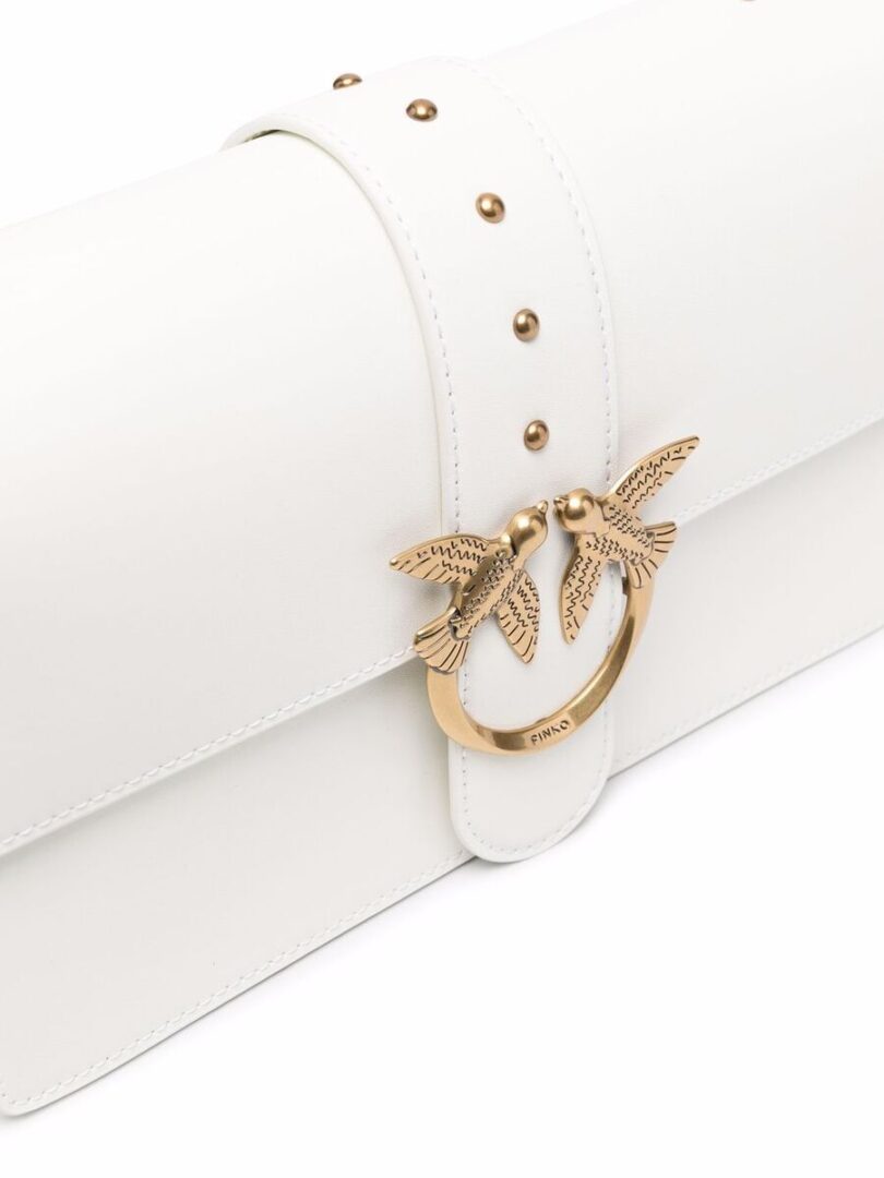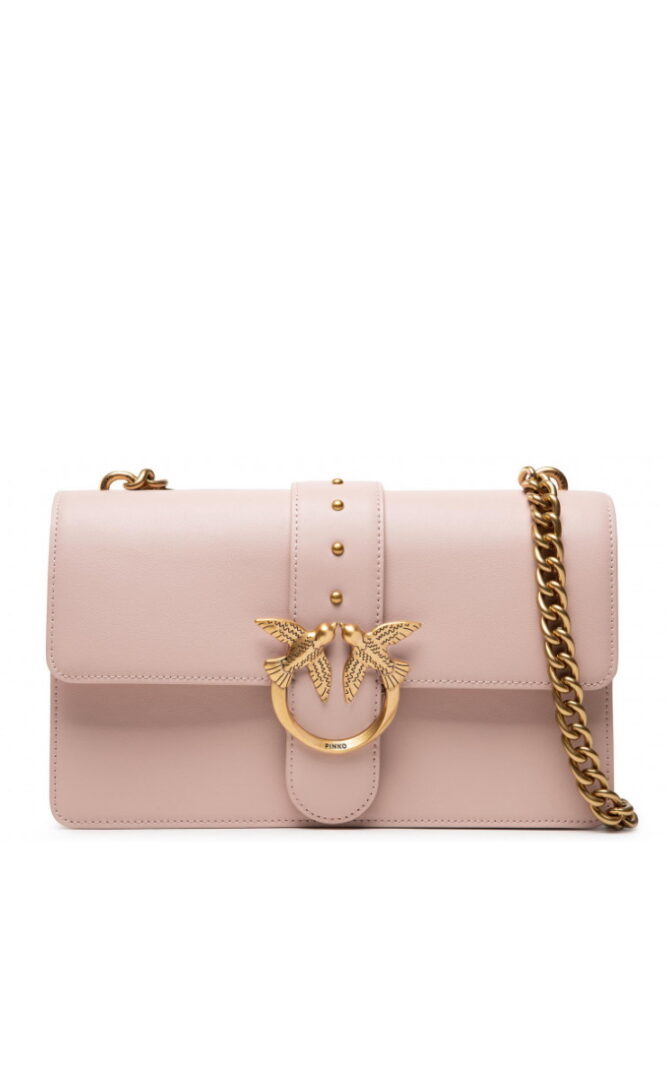 Сумка Classic Love Bag Icon из мягкой шелковистой кожи. Застежка с кожаным ремешком и заклепками дополнена легендарной пряжкой Love Birds Diamond Cut из металла с гальваническим покрытием цвета античного золота. Внутреннее отделение на подкладке из микрофибры включает карман-перегородку на молнии и плоский карман из кожи. Плечевой ремень из кожи украшен ювелирными буквами, образующими фразу PINKO TI AMO.