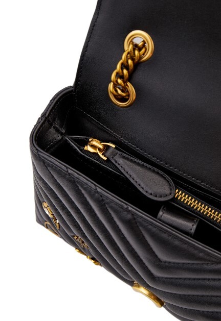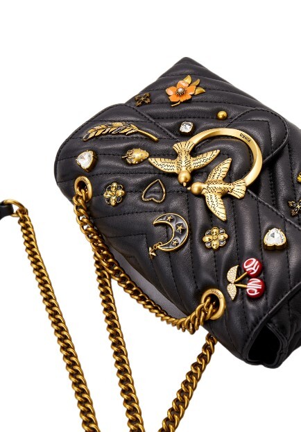 Мини-сумка Lady Love Bag Puff из стеганой кожи наппа с шевронным узором отличается декоративными значками спереди. Застежка украшена легендарной пряжкой Love Birds Diamond Cut из металла. Внутреннее отделение на подкладке из микрофибры дополнено карманом-перегородкой на молнии и плоским карманом. Плечевой ремень представляет собой комбинацию классической металлической цепочки с круглыми звеньями и практичного наплечника из кожи.