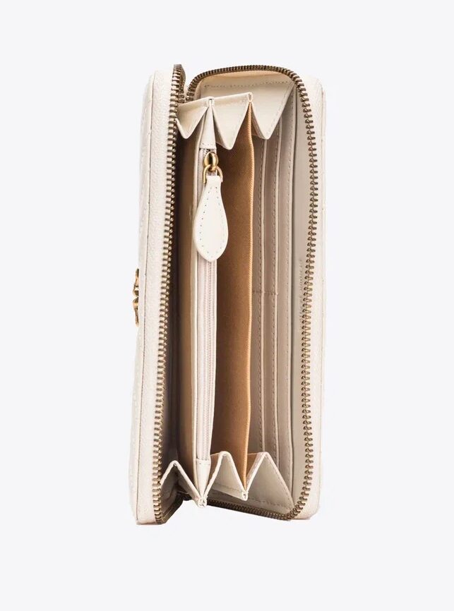 Кошелек с круговой молнией из кожи наппа с косой простежкой шеврон, украшенный металлическим фирменным знаком в виде влюбленных ласточек Love Birds с гальваническим покрытием «античное золото». Внутри кошелек обшит микрофиброй и разделен на четыре отделения, одно из них на молнии, а два других имеют кармашки для кредитных карт.