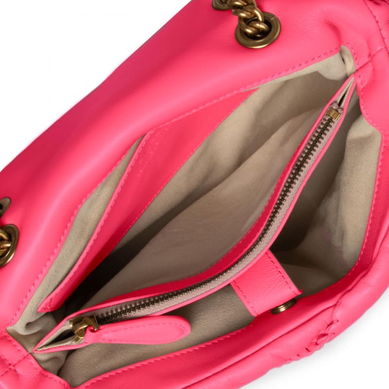 Мини-сумка Love Bag Puff из кожи наппа отличается оригинальным узором с эффектом сборки. Застежка украшена легендарной пряжкой Love Birds Diamond Cut из металла. Внутреннее отделение на подкладке из микрофибры дополнено карманом-перегородкой на молнии и плоским карманом. Плечевой ремень представляет собой комбинацию классической металлической цепочки и практичного наплечника из кожи наппа.