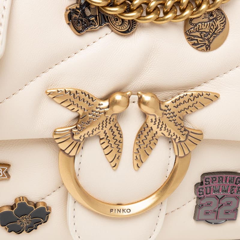 Сумка Mini Love Bag Puff из мягкой кожи наппа с крупной косой простежкой украшенная металлическими значками. Застежка дополнена легендарной металлической пряжкой Love Birds с гальваническим покрытием цвета античного золота. Внутри сумка обшита микрофиброй, разделена карманом-перегородкой на молнии и снабжена карманом на стенке. Плечевой ремень длиной 110 см представляет собой комбинацию классической металлической цепочки с круглыми звеньями и практичного наплечника из кожи наппа.